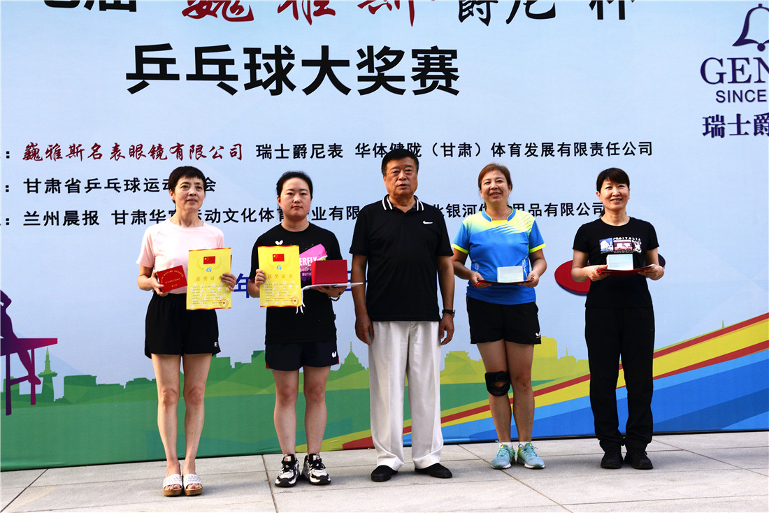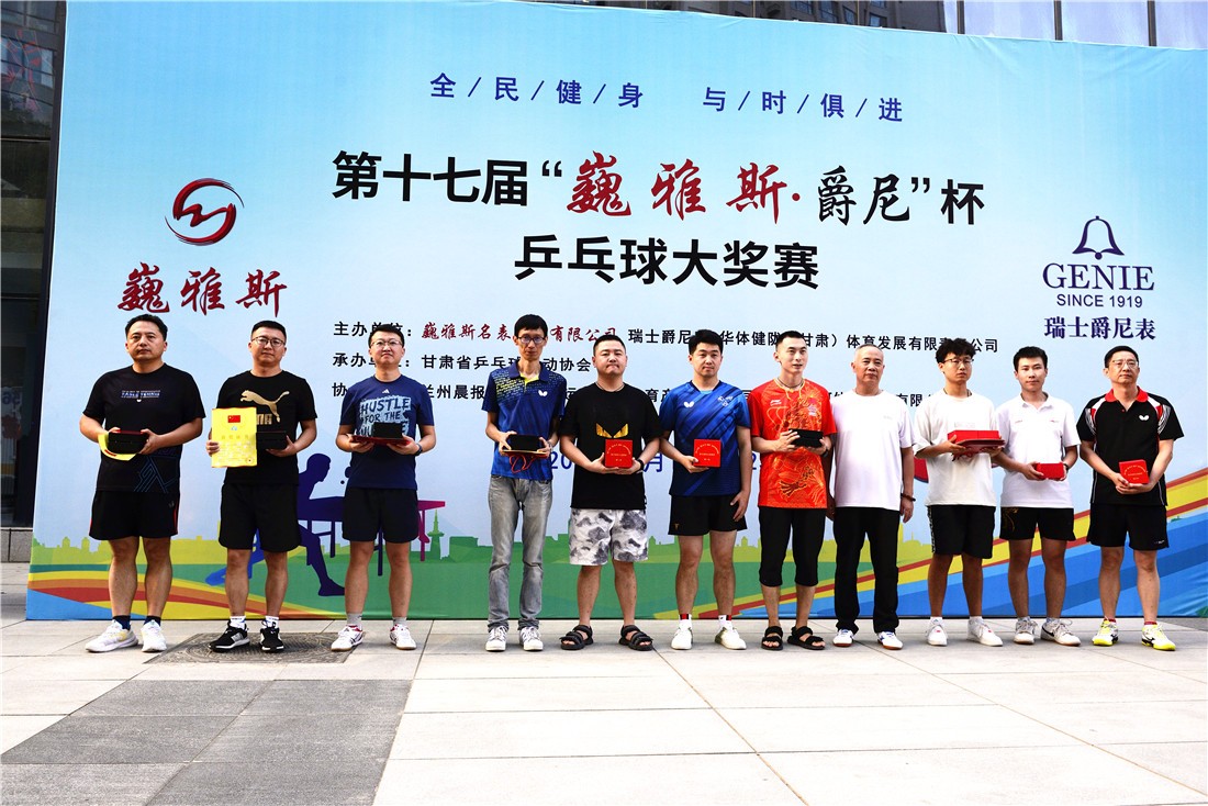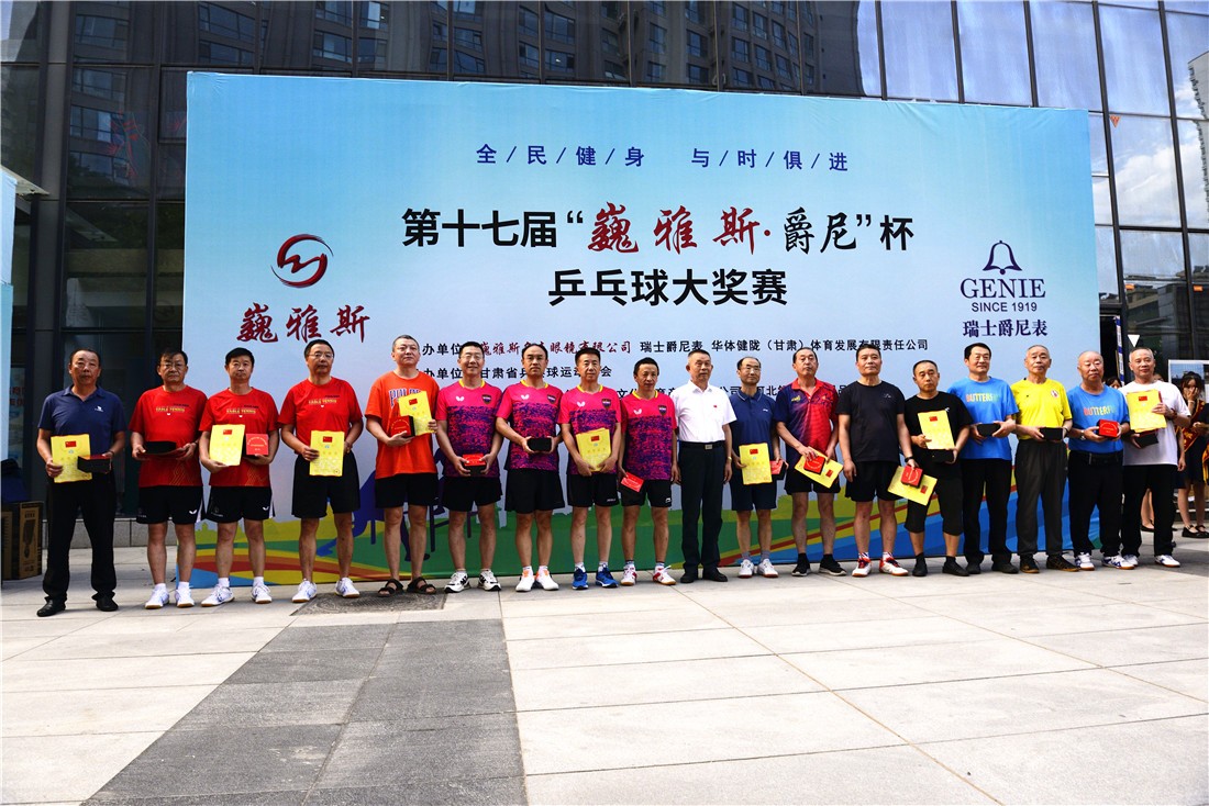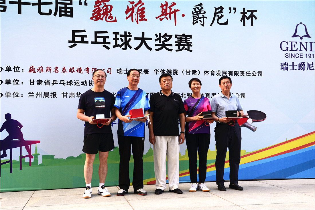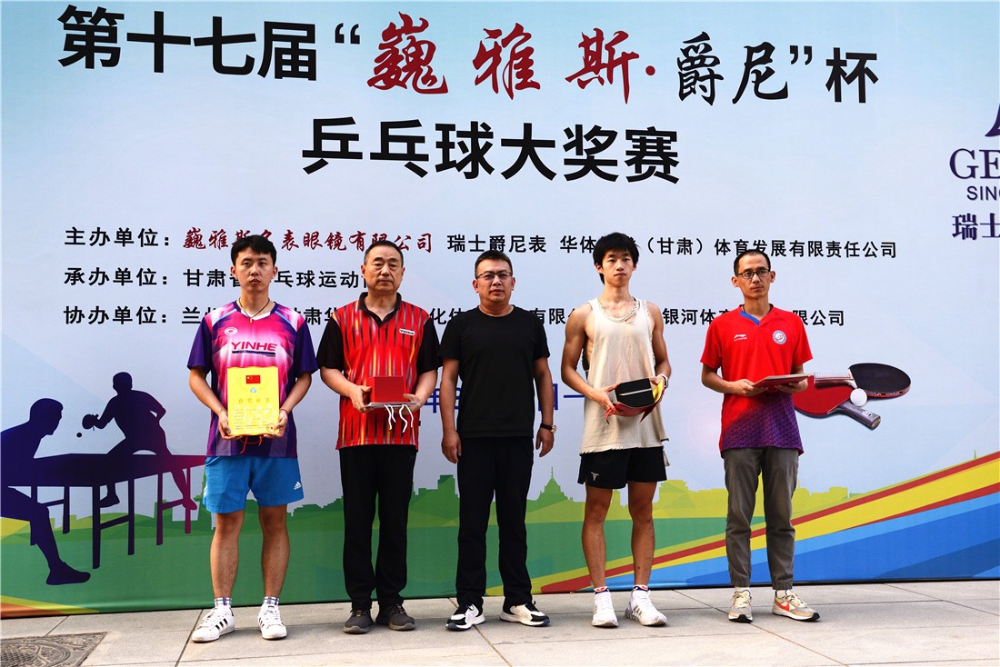 第十七屆 “ 巍雅斯 · 爵尼杯”乒乓球大(dà)獎賽比賽,經過兩天緊張激烈的角逐,8月20日下午,成人(rén)組和(hé)嘉賓組名次花(huā)落其主。中國鍾表商會(huì)副會(huì)長、甘肅省眼鏡協會(huì)會(huì)長、甘肅省乒協副會(huì)長、遼甯寶聖鍾表眼鏡有限公司董事長裴正江,甘肅省乒乓球運動協會(huì)會(huì)長韓力,甘肅省乒乓球運動協會(huì)副會(huì)長張占學、姚天宏,甘肅省乒乓球運動協會(huì)顧問苗發,青海省乒協副主席高(gāo)麗(lì)嚴,遼甯寶聖鍾表眼鏡有限公司總裁裴明(míng)偉,遼甯寶聖鍾表眼鏡有限公司副總裁裴明(míng)宏出席頒獎儀式并為(wèi)獲獎代表隊和(hé)運動員頒獎。甘肅省乒協秘書(shū)長宋建農主持頒獎儀式。