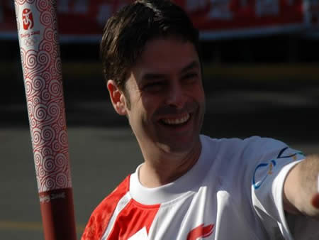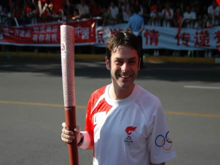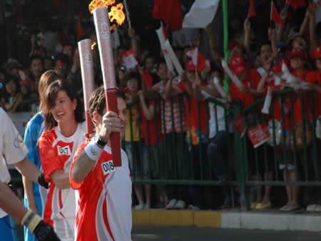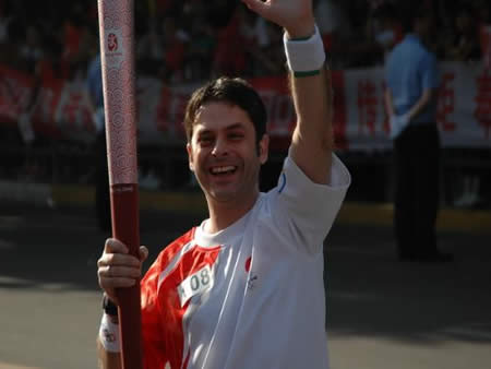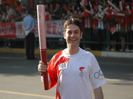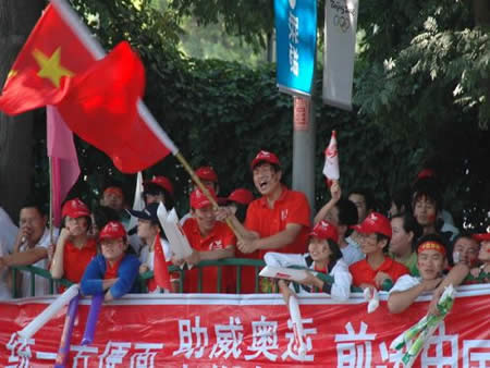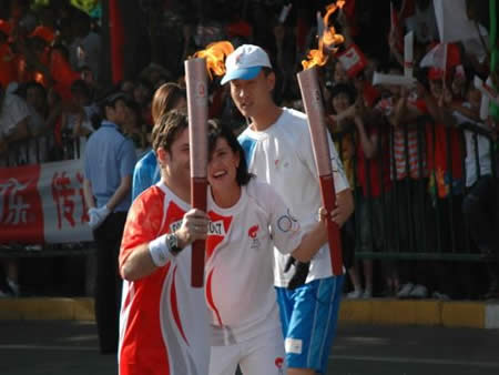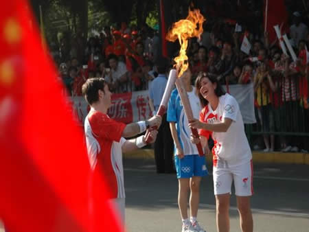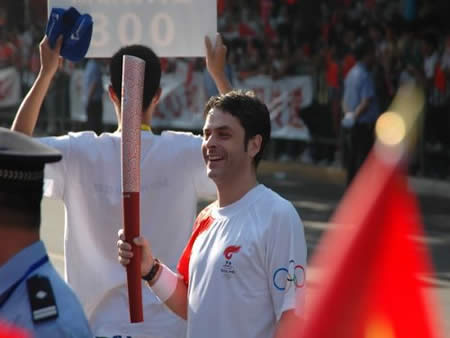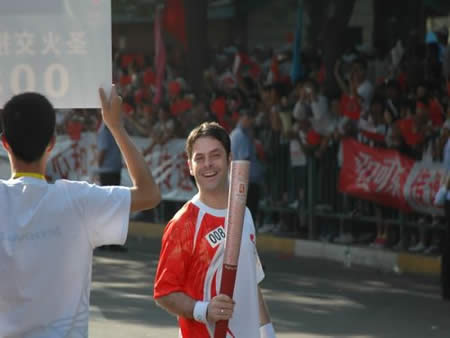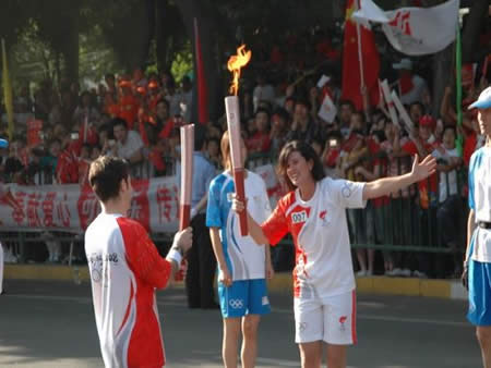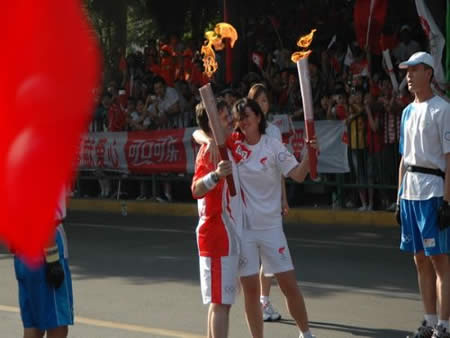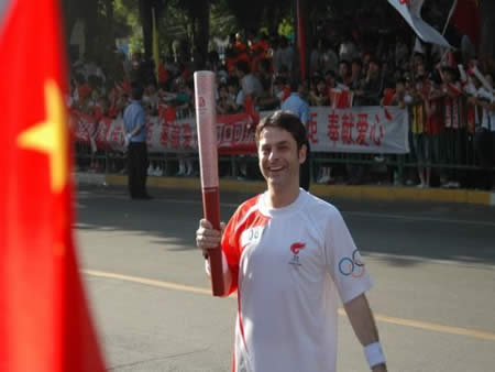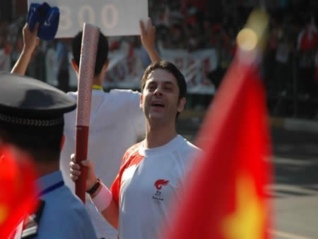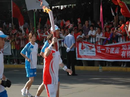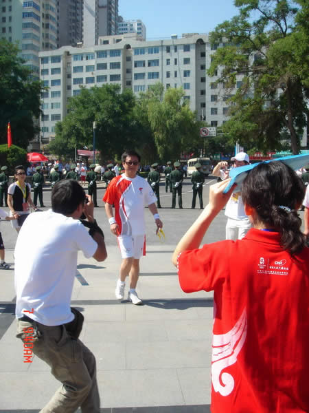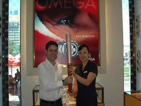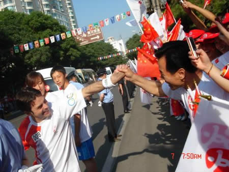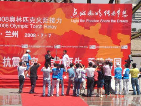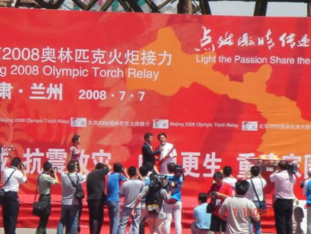 2008奧運火(huǒ)炬在蘭州傳遞,歐米茄中國區(qū)副總裁Carlos先生(shēng)是第8号火(huǒ)炬手,蘭州巍雅斯員工啦啦隊為(wèi)奧運加油